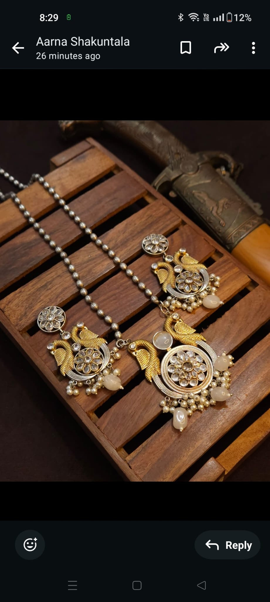 Dual Tone Long Necklace with Peacocks & Pearls