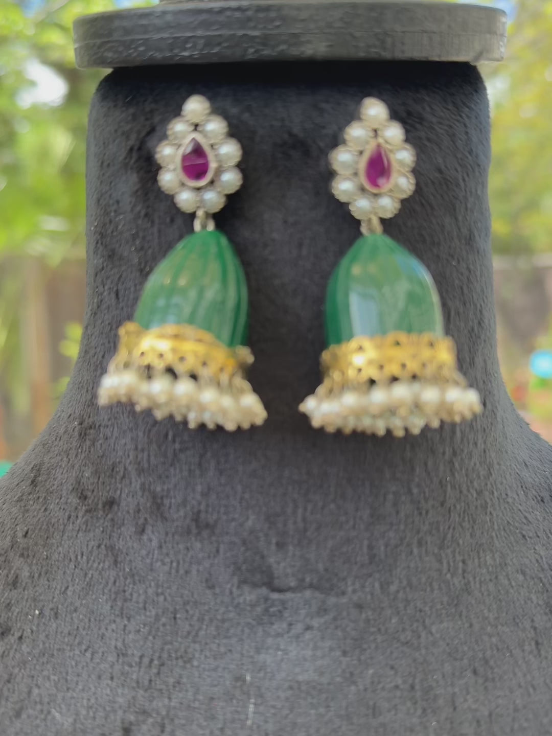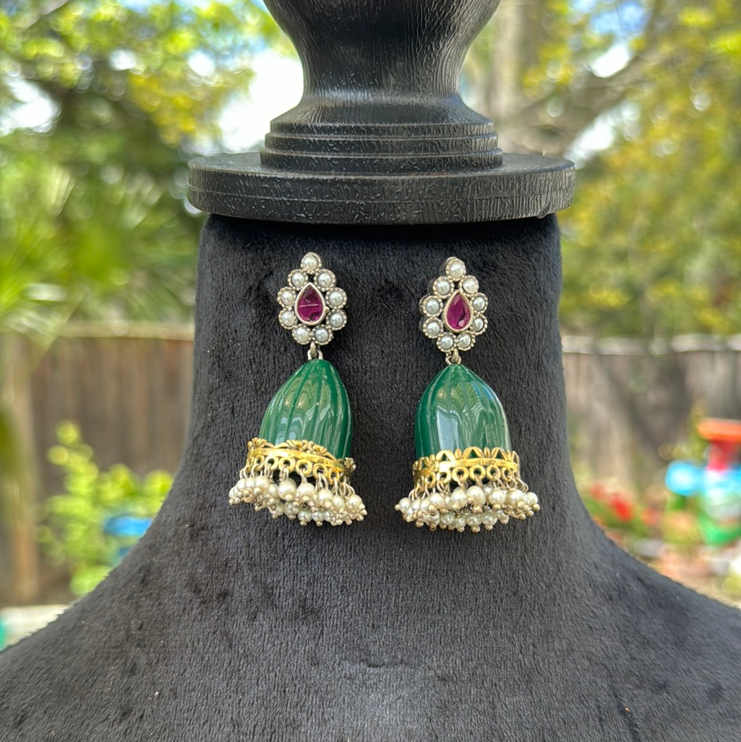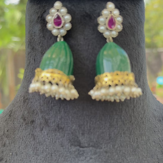 Green Stone Jhumkas with Pearls
