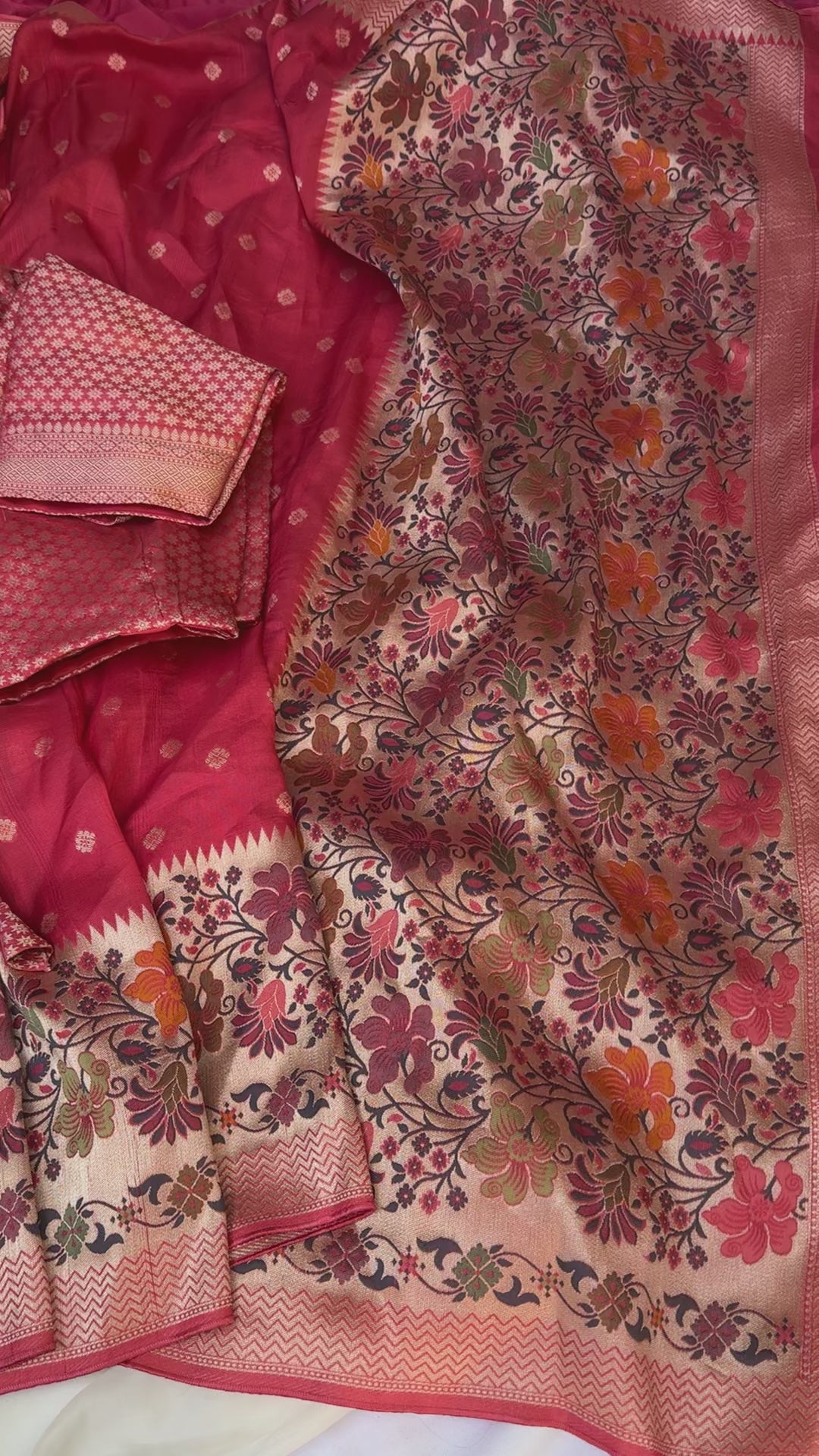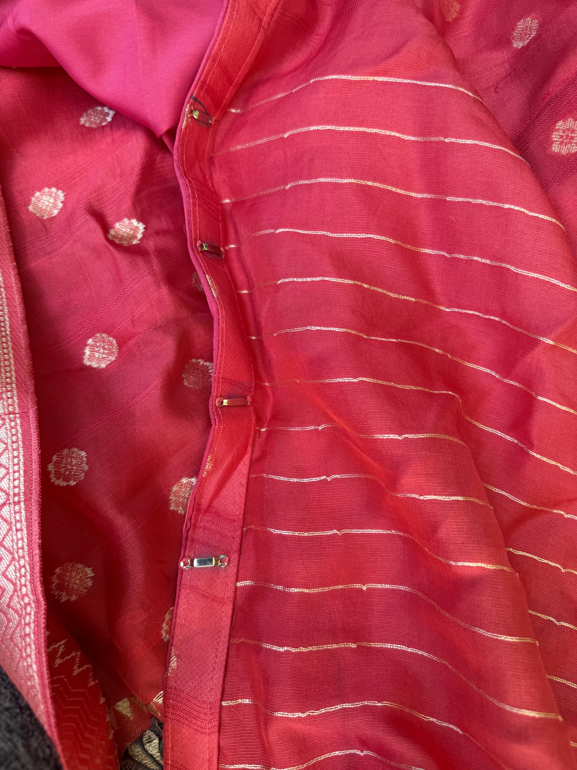 Prestitched Saree with adjustable waist size. Saree is provided thick crepe lining, therefore pettycoat is not required. Blouse is prestitched to a size of 38 and can be expanded upto 44.