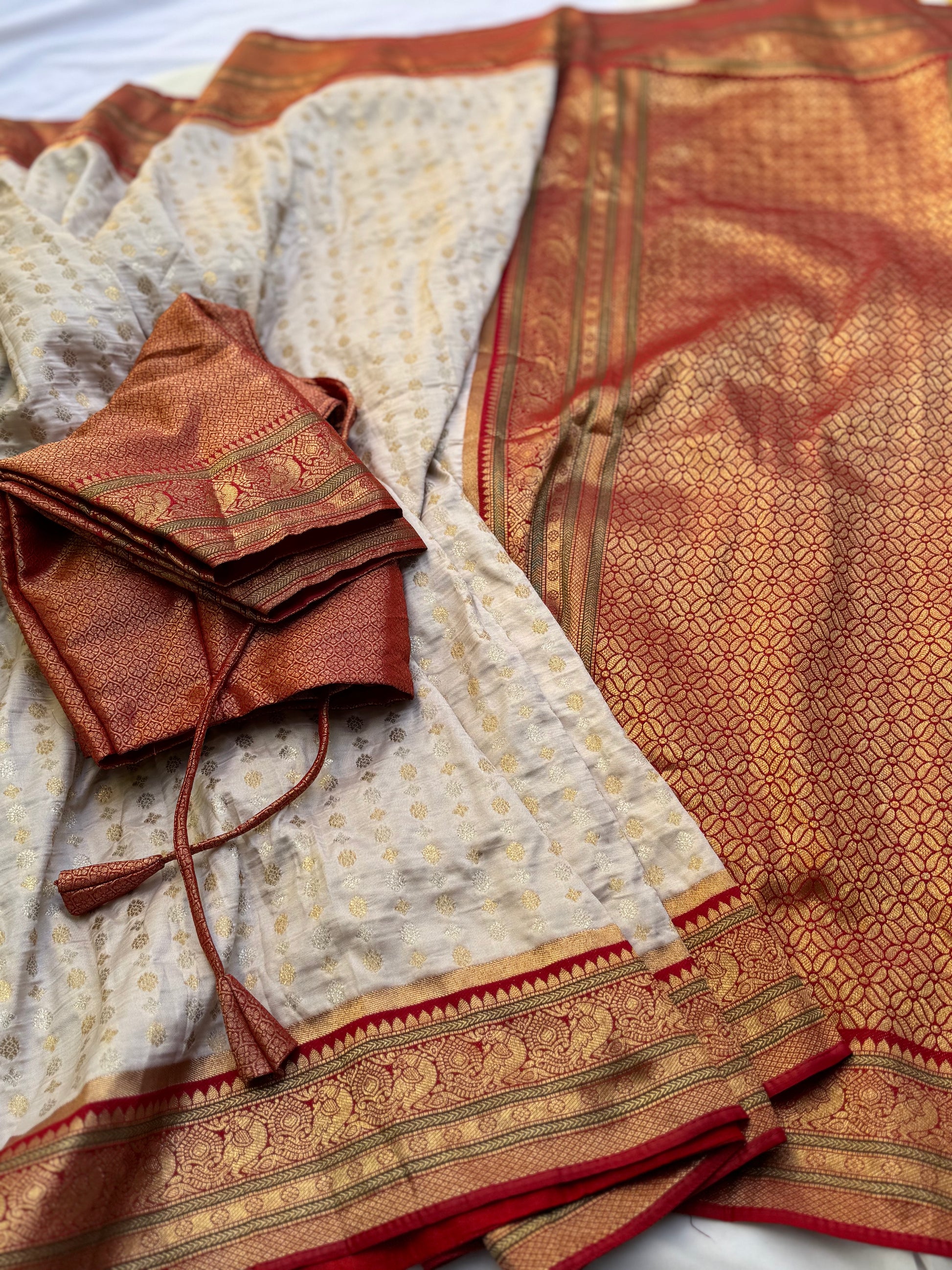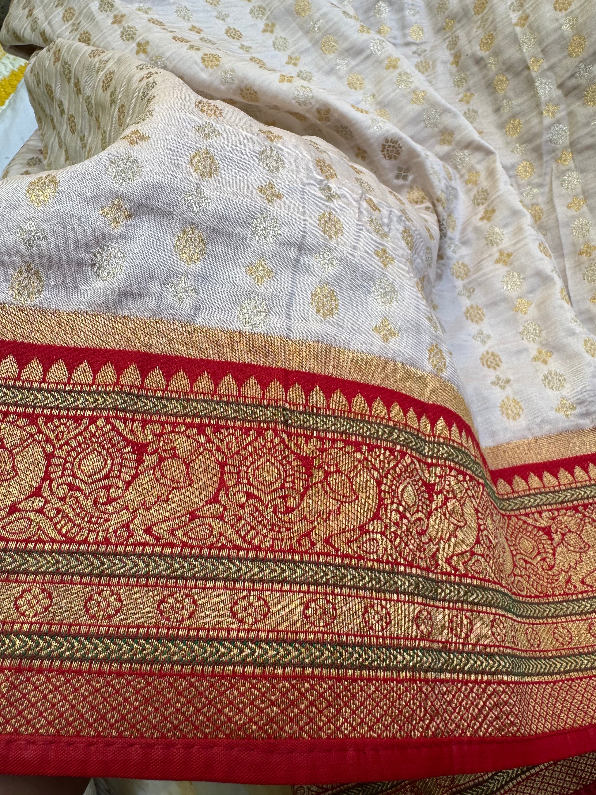 Traditional Off-white Banarasi saree with Red Border (Pre-stitched Saree)